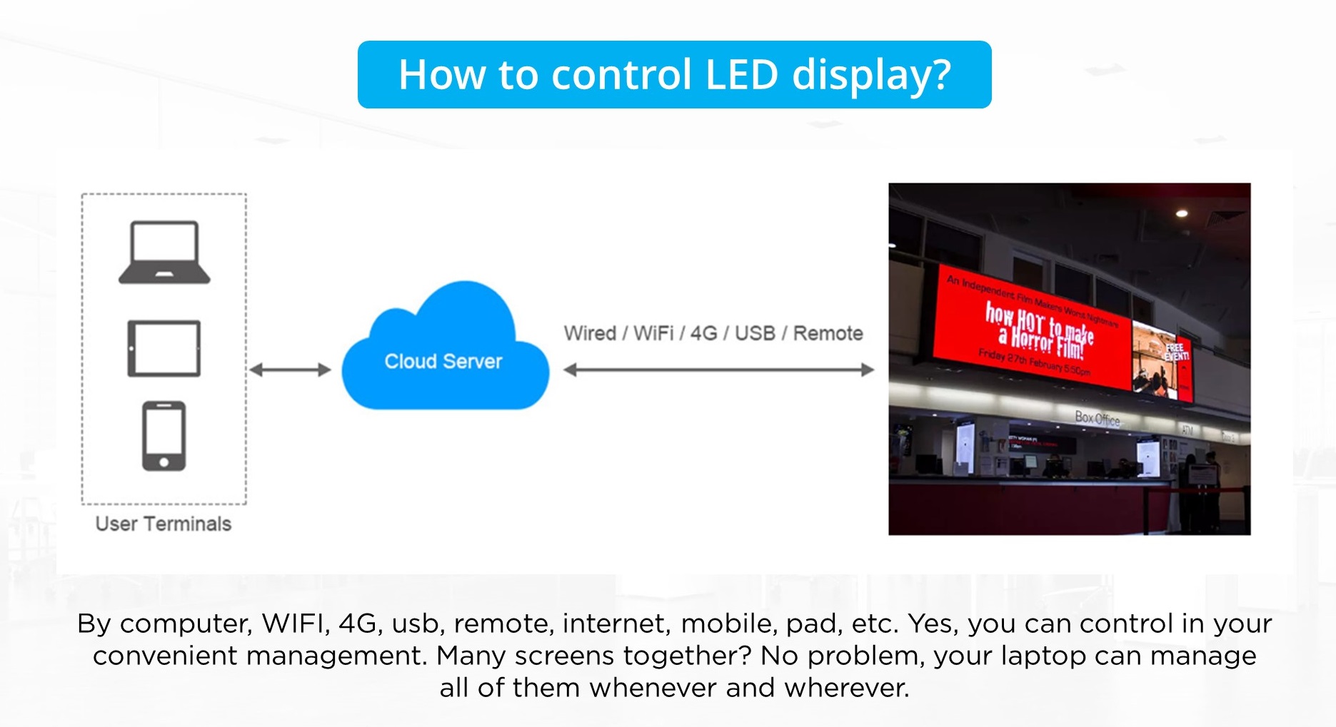 1. The LED display can be controlled in a variety of ways. And can also be remote control, very convenient to use.