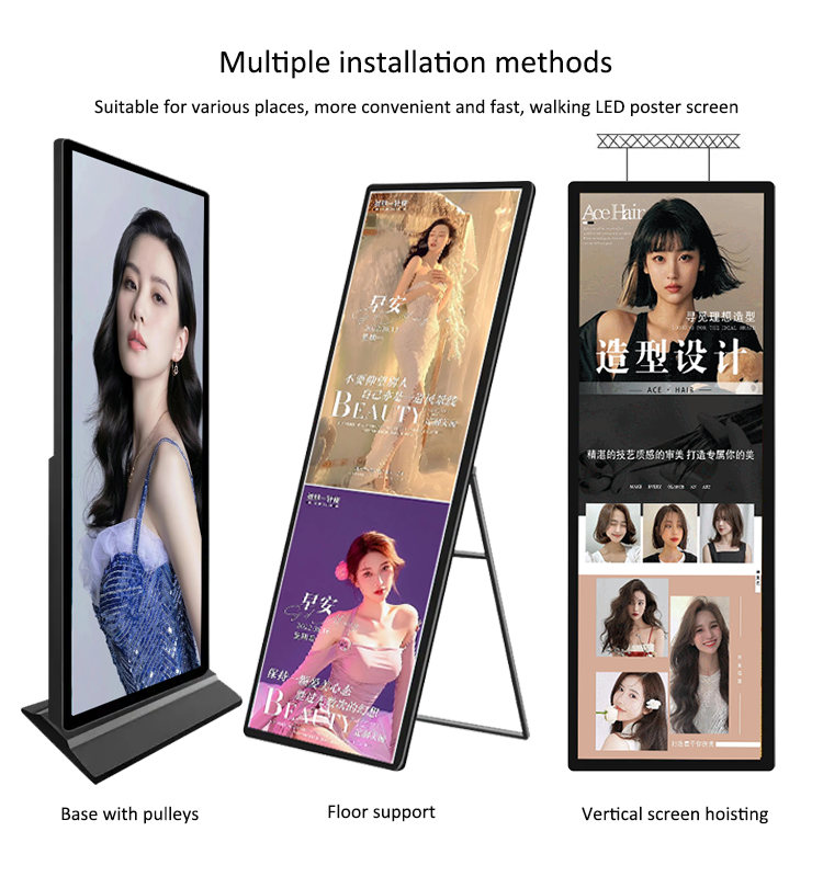 The base of the poster display is mounted with wheels for easy movement; humanity design and high definition picture quality present a distinctive visual effect.
