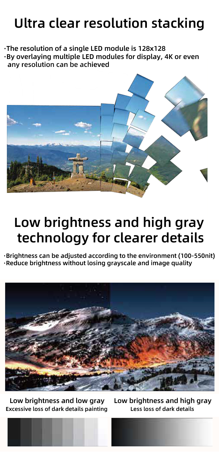 10.Low brightness and Hight gray scale:14Bit-16Bit gray scale to bring excellent performance when brightness is reduced to 20%.